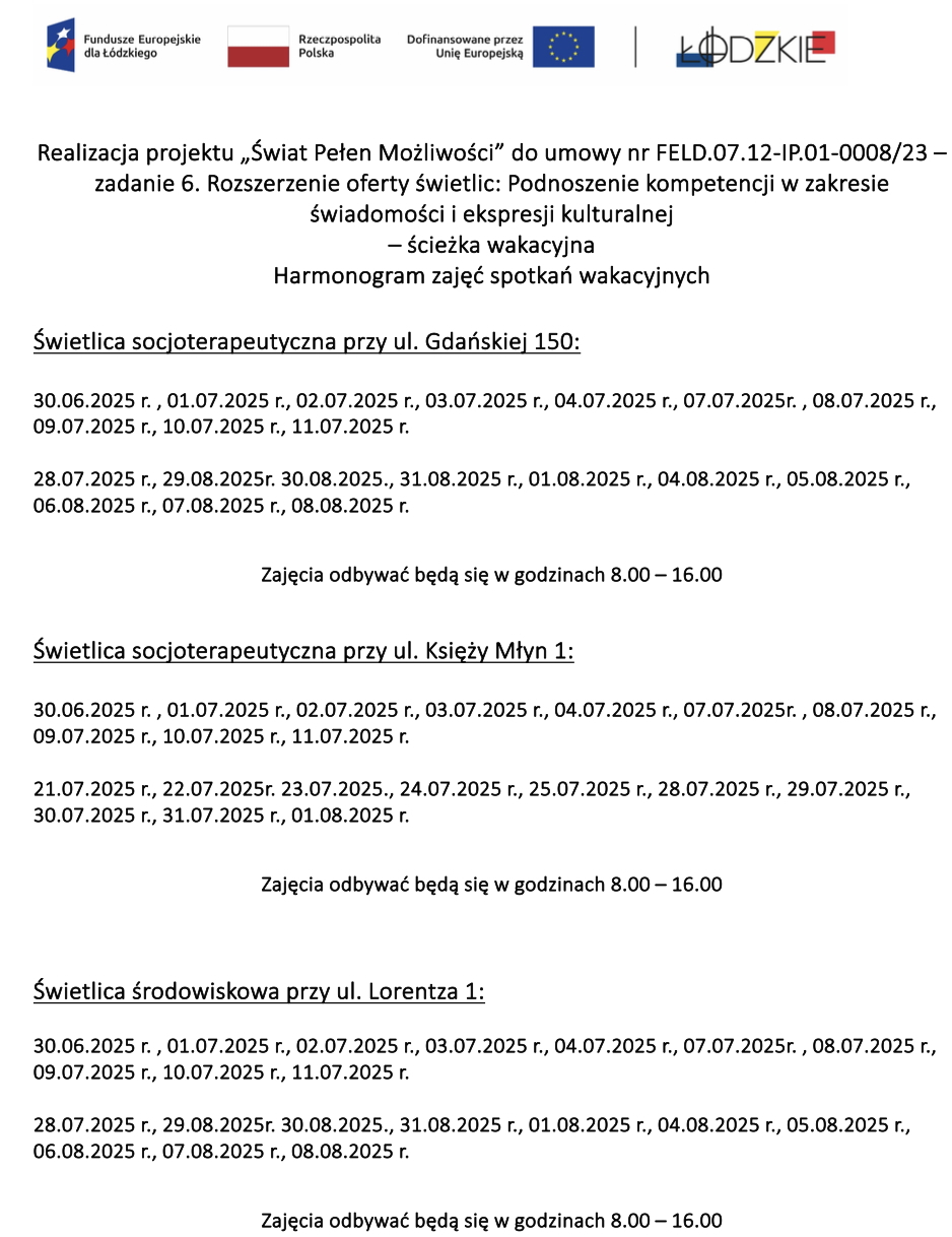 Realizacja projektu FELD.07.12-IP.01-0008/23 – zadanie 6. Rozszerzenie oferty świetlic: Podnoszenie kompetencji w zakresie świadomości i ekspresji kulturalnej – ścieżka wakacyjna